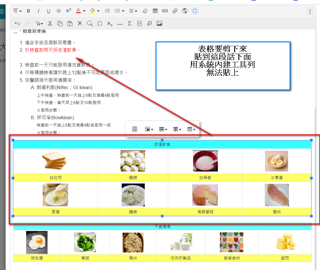 | 荷包蛋 | 青菜 | 糙米 | 任何奶製品 | 高纖食物 | 起司 |
