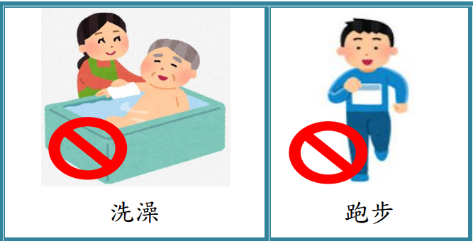 - 24小時內,請勿下床洗澡(但可以擦澡)及劇烈運動,如:跑步或蹲下起立。