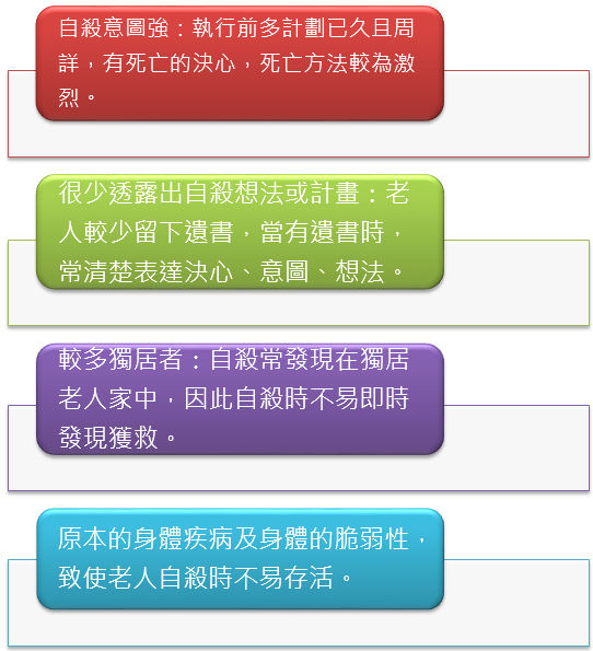 - 原本的身體疾病及身體的脆弱性,致使高齡長者自殺時不易存活。