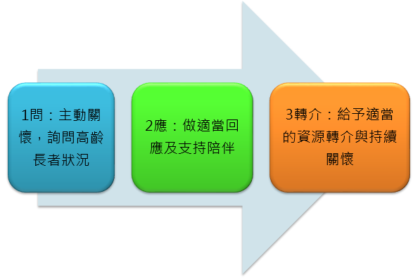 - 「問」:主動關懷,詢問高齡長者狀況。
