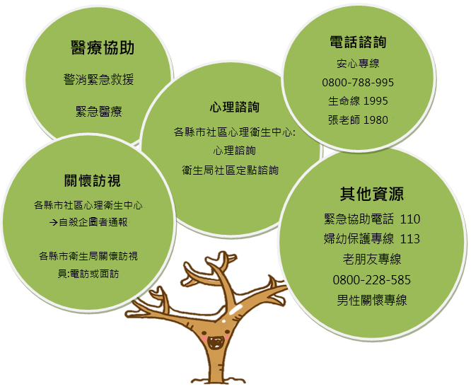 - 關懷訪視:各縣市社區心理衛生中心提供自殺企圖者通報;衛生局關懷訪視員則能提供電訪和面訪。