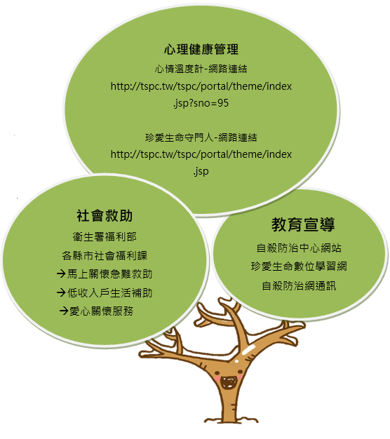 - 教育宣導:可多利用自殺防治中心網站、珍愛生命數位學習網、自殺防治網通訊。