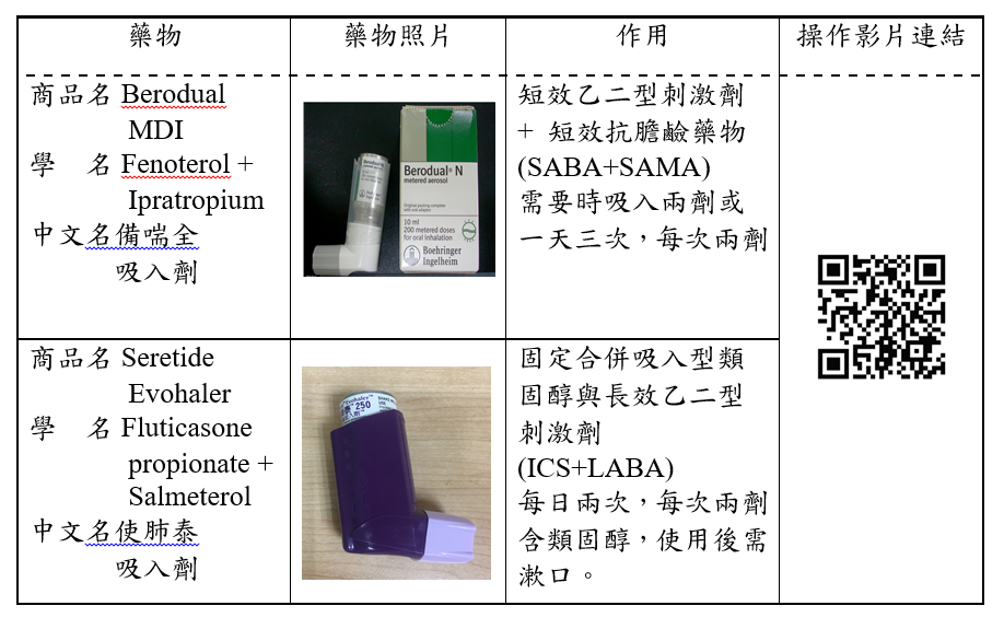 固定合併吸入型類固醇與長效乙二型刺激劑 (ICS+LABA) 每日兩次,每次兩劑。含類固醇,使用後需漱口 |