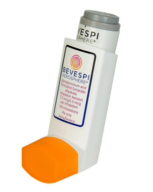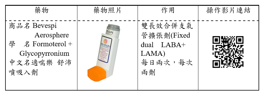 | 商品名:Bevespi Aerosphere 學名:Formoterol +Glycopyrronium 中文名:適喘樂舒沛噴吸入劑 |