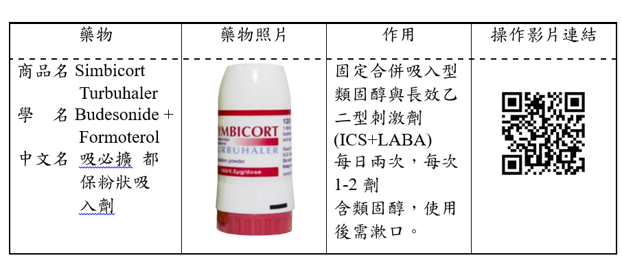 | 商品名: Simbicort Turbuhaler 學名: Budesonide + Formoterol 中文名:吸必擴都保粉狀吸入劑 |